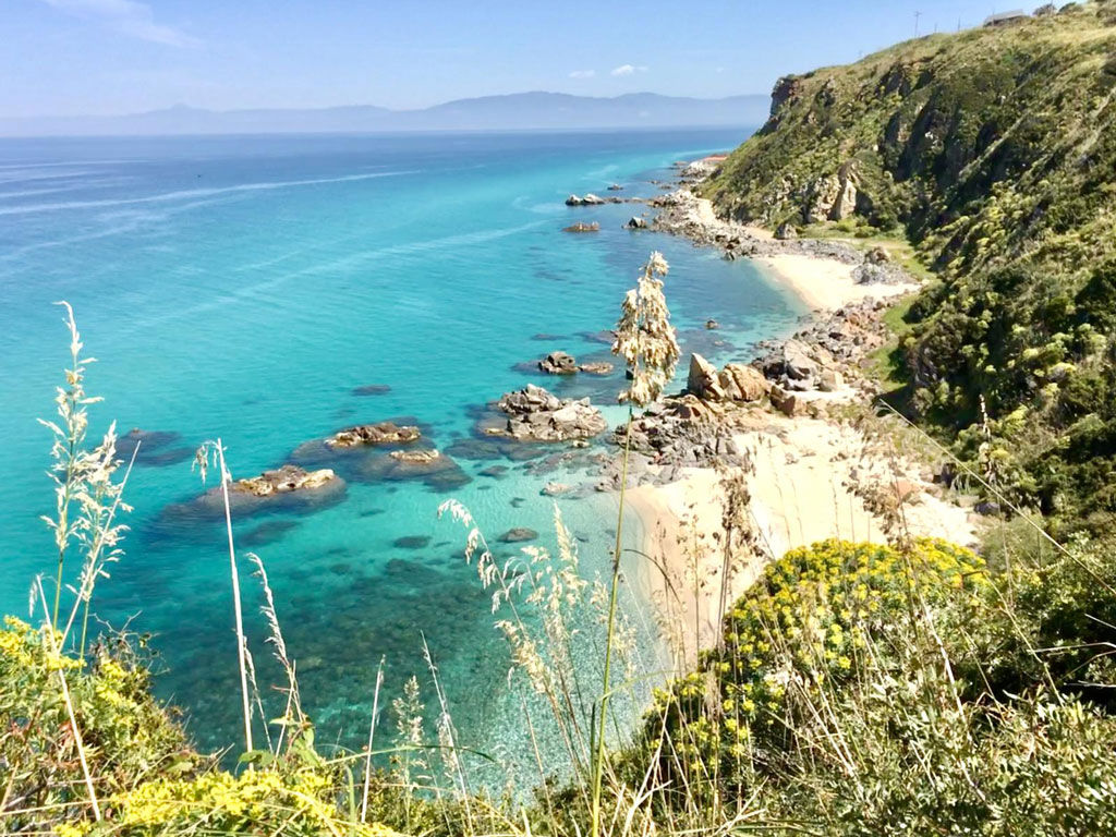 The warm colors of the coastline, crystal-clear sea, wild nature, the scent of typical Mediterranean vegetation, golden-sand inlets, Isola Bella of Tropea, the Skeleton Cave, Grotticelle Lagoon, Riaci Canyon, the Pirate Waterfall, the white cliffs of Capo Vaticano, and the beautiful white beach of Praja di Fuoco.